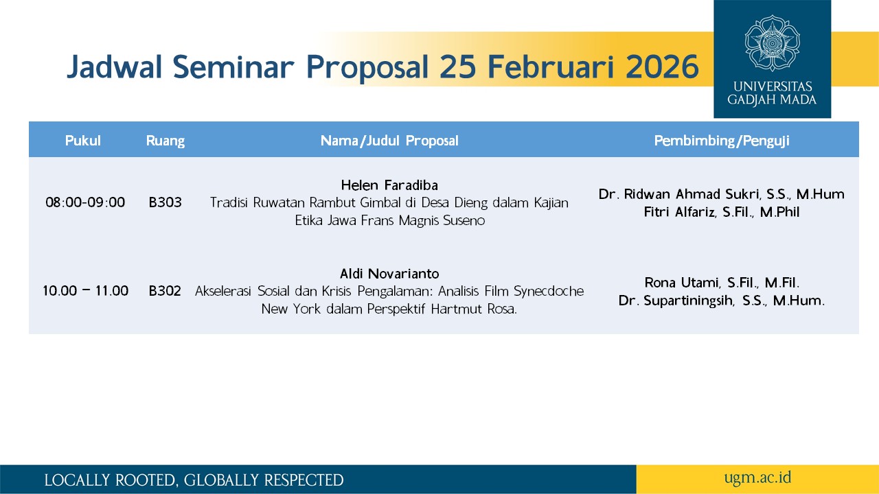 Jadwal Seminar Proposal Program Sarjana Fakultas Filsafat UGM 25 Februari 2026 akademik, informasi, jadwal 24 Februari 2026, 01.43 Oleh: rahmatalfianto 0